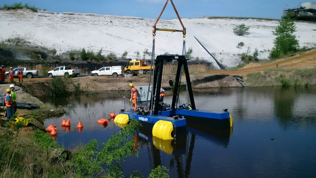 Dragflow suministró una draga teledirigida DRP120 equipada con una bomba de alta presión EL1204 HH. Para eliminar eficazmente los sedimentos, se utilizaron dos excavadoras laterales eléctricas EXEL20 y un anillo jet ring para mezclar mejor el componente sólido fino. El sistema de dragado con bomba y excavadora es capaz de bombear 150 m³/h a una distancia de 200 m, salvando un desnivel de 60 m, para descargar el material en una cinta transportadora que devuelve el sedimento a una zona específica de la mina.